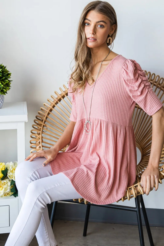 Heimish Full Size Waffle Knit V-Neck Babydoll Top