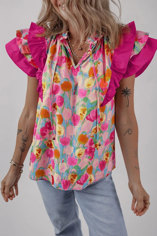 Floral Ruffled Layered Short Sleeve Tie Neck Blouse