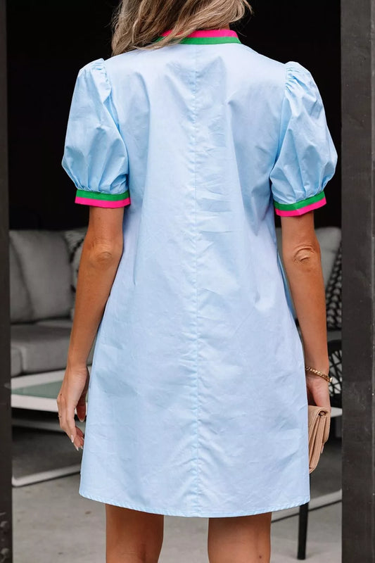 Puff Sleeve Mini Dress with Contrast Trim