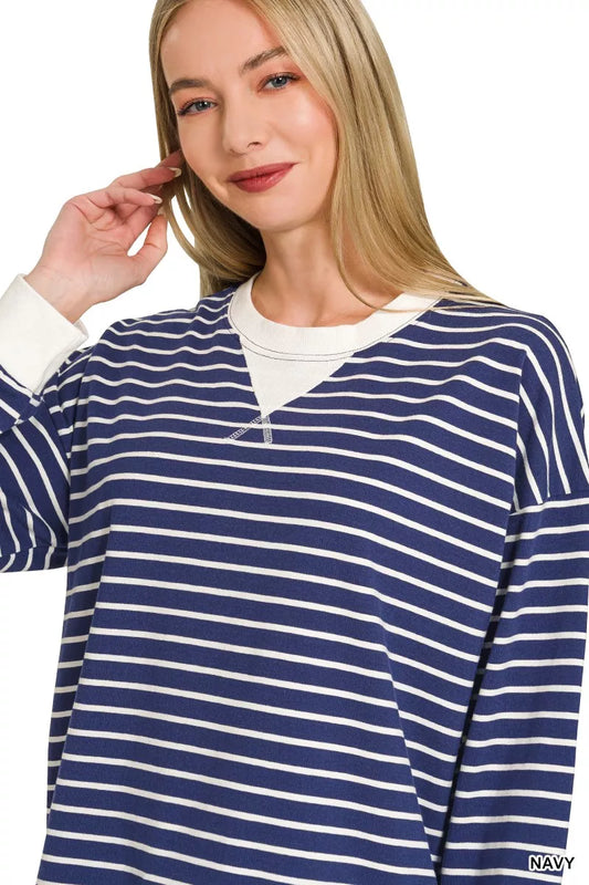 Zenana Contrast Striped Round Neck Sweatshirt