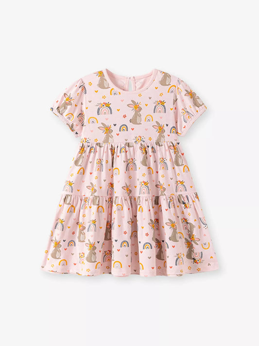 Children's Tiered Bunny Rainbow Print Casual Dress