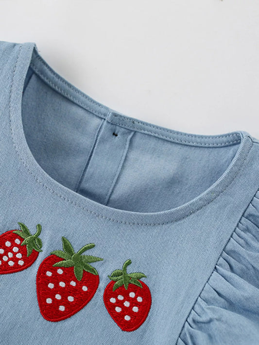 Children's Strawberry Embroidered Puff Sleeve Denim Dress