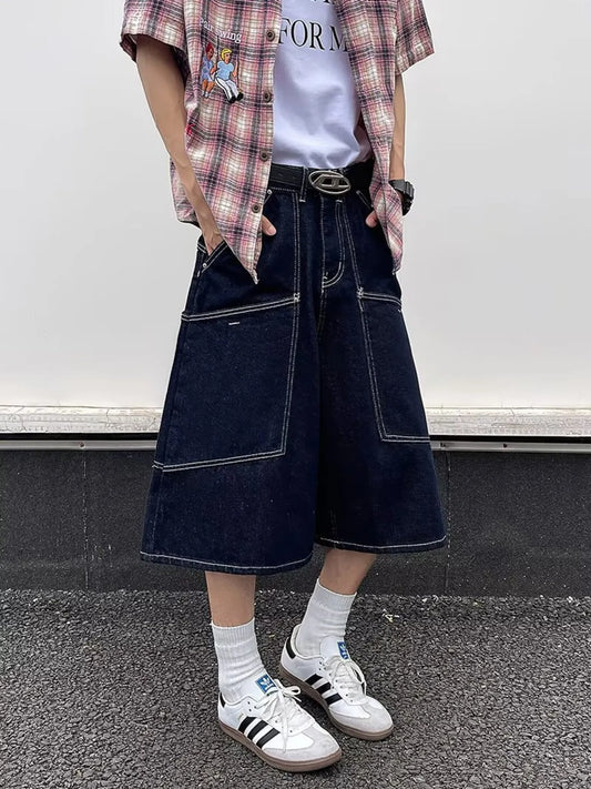Men's Wide Leg Denim Capris with Contrast Stitching