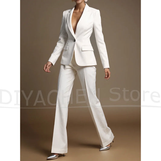 Chic Women's White Suit Elegant One Button Formal Office Casual Outfits Solid Color Fashion Wedding Party Pants Sets Two Piece