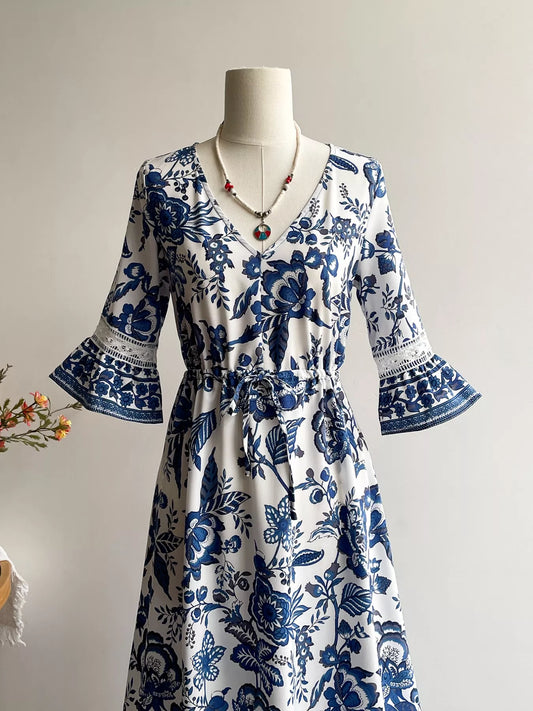 Floral Print Tasseled Tied Sleeve Empire Waist Dress