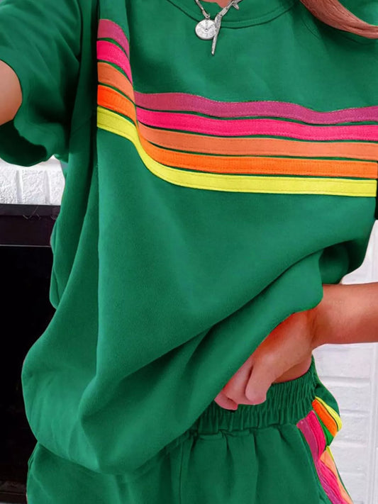 Full Size Striped Round Neck Top and Shorts Set Plus Size