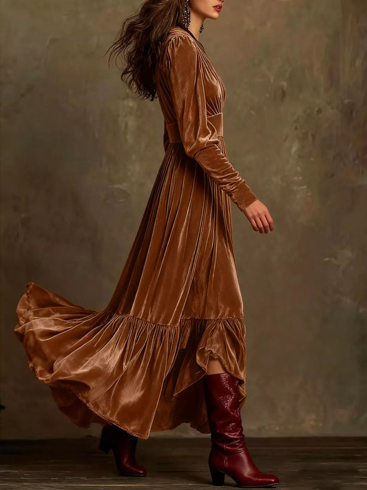 Elegant Velvet V-Neck Long Sleeve Maxi Dress